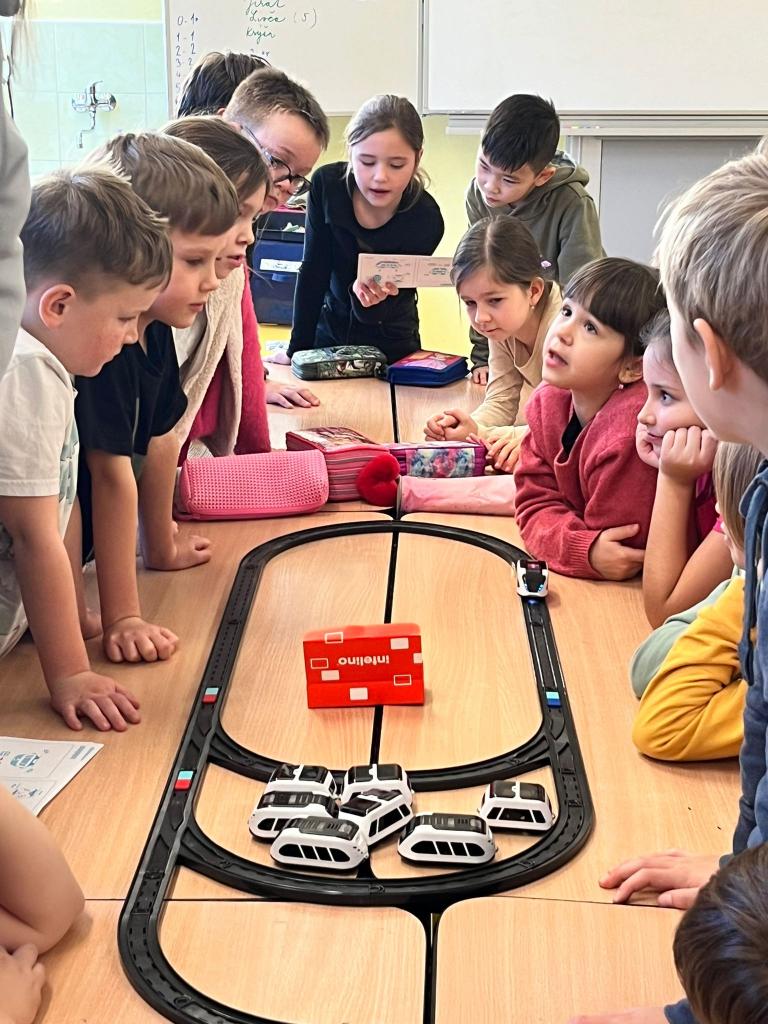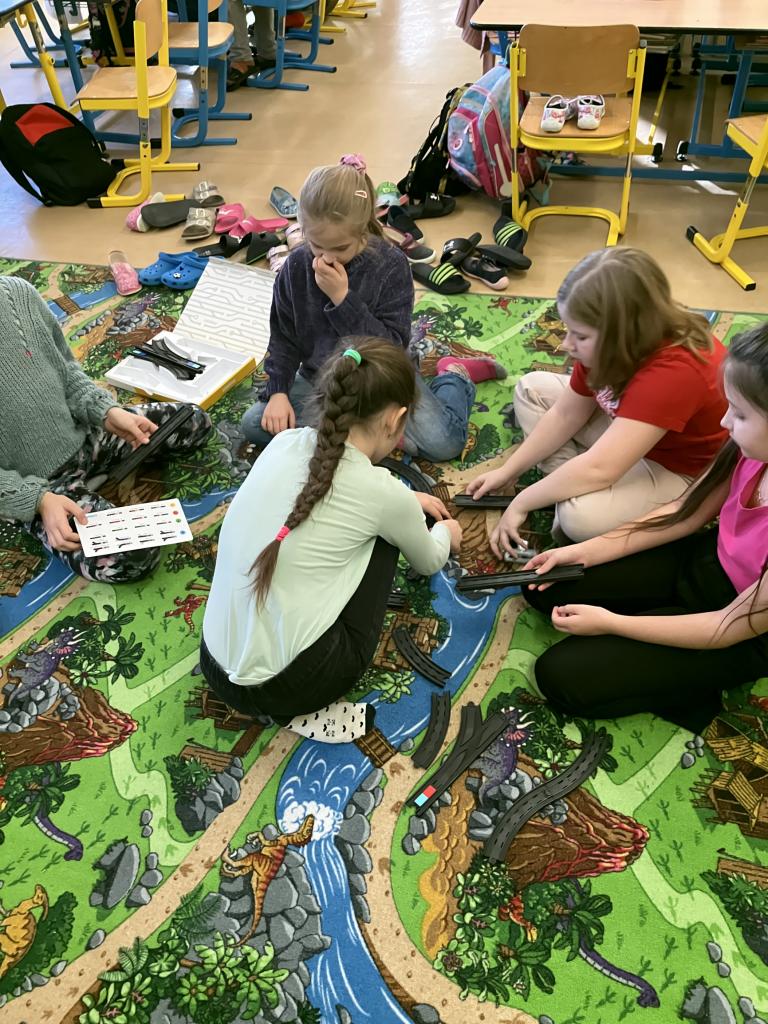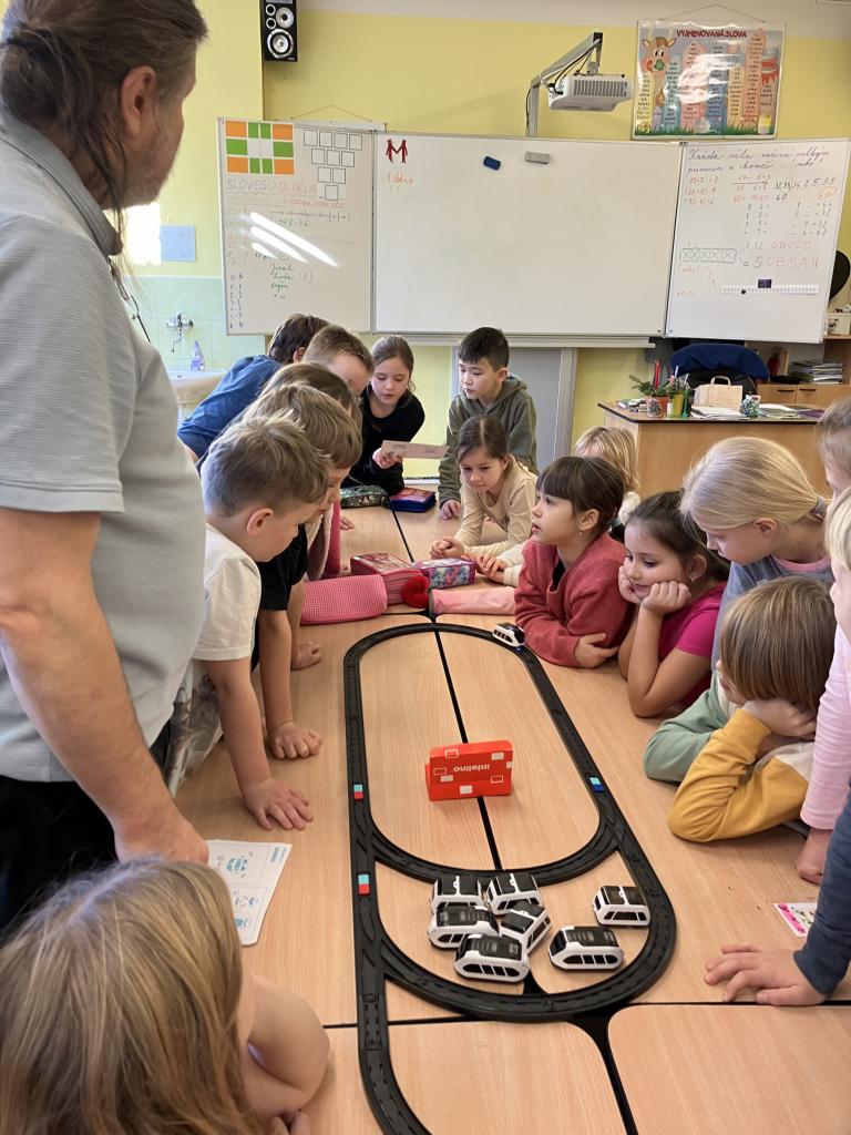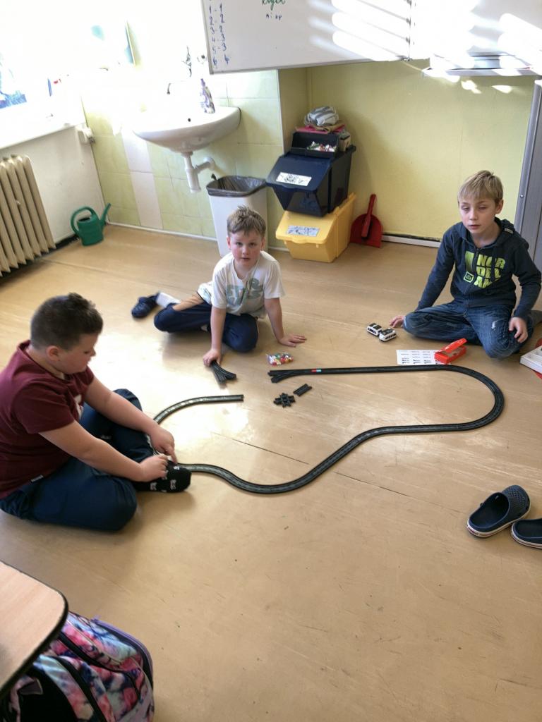 První seznámení s programovatelnou stavebnicí si děti pořádně užily. Přesto, že ještě nemají informatiku, mohly si vyzkoušet různá sestavování kolejnic i vkládání barevných segmentů do kolejiště, které ovlivňovaly jízdu vláčků. Určitě neměly stavebnici naposled. Panu učiteli Zahálkovi děkujeme za zaučení. Bylo to prima.