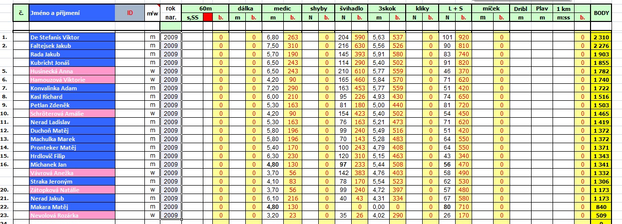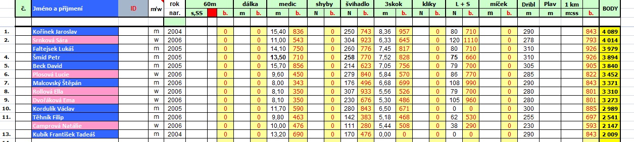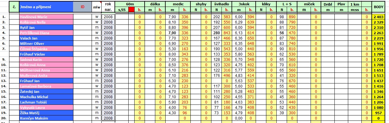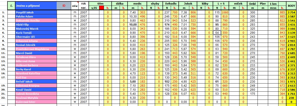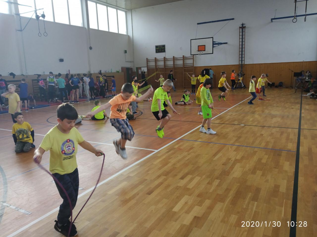 I letos soutěžili žáci v disciplínách leh-sedy, skok přes švihadlo, trojskok, hod medicinbalem a starší ročníky ještě dribling.