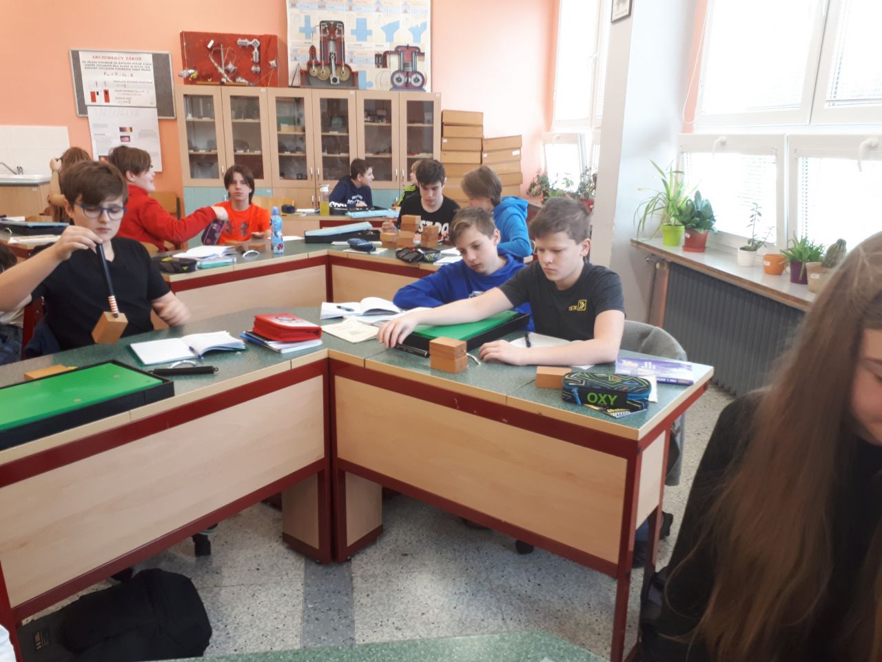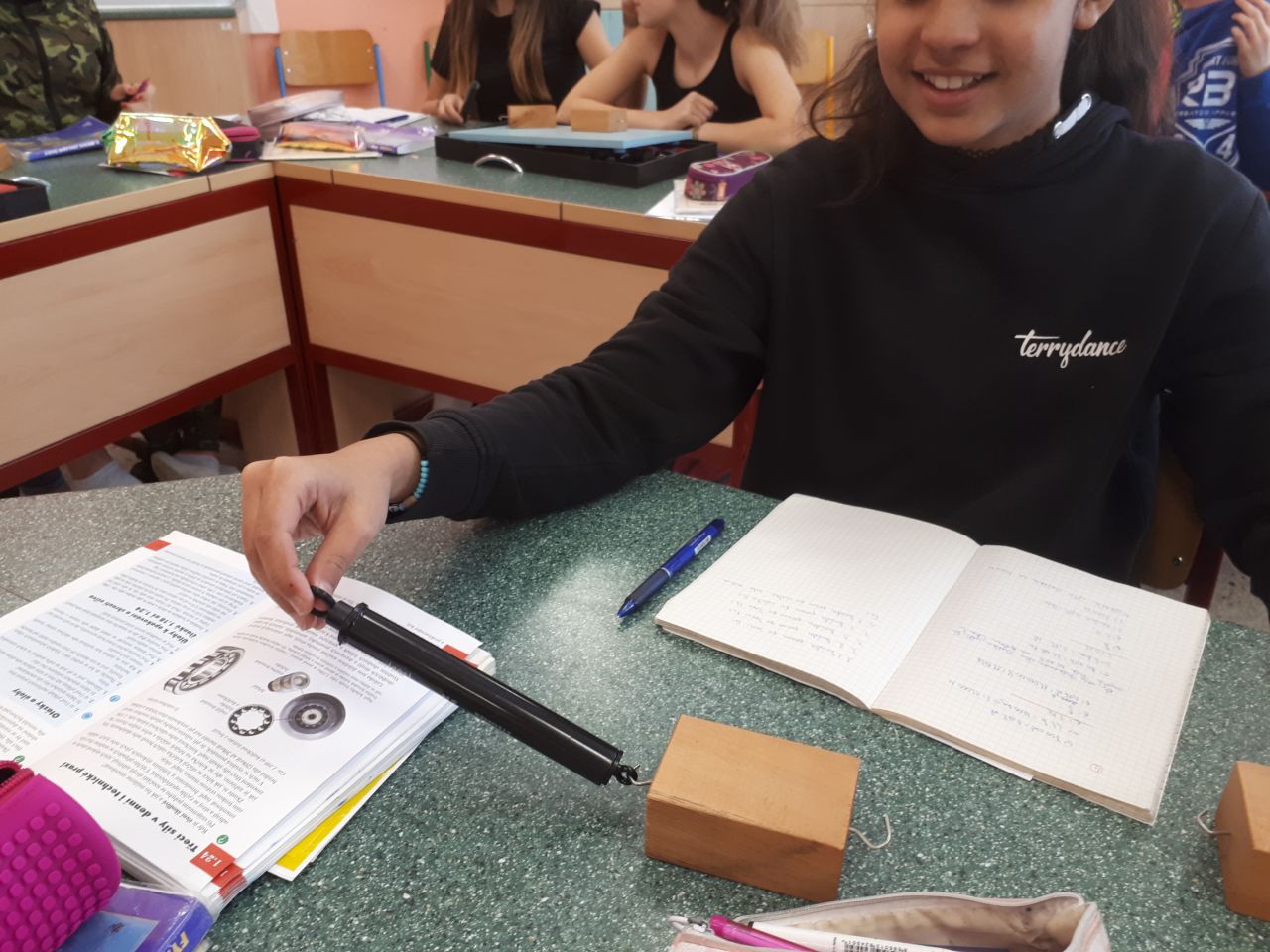 Kdy je větší třecí síla ? Co ovlivňuje velikost třecí síly? Prověření teoretických poznatků při měření třecí síly siloměry na různých styčných plochách si vyzkoušeli žáci 7.A při laboratorní práci z fyziky.Měřili třecí sílu při styku tělesa s lavicí, různými obaly, smirkovými plátny dokonce i se svou vlastní mikinou.