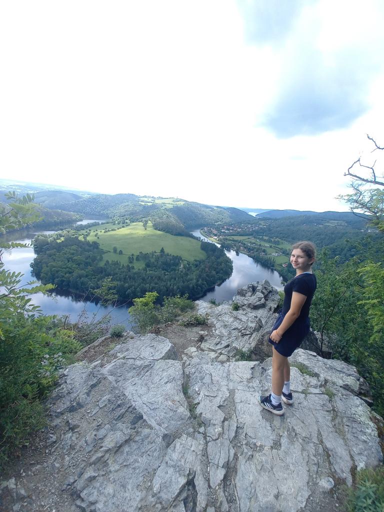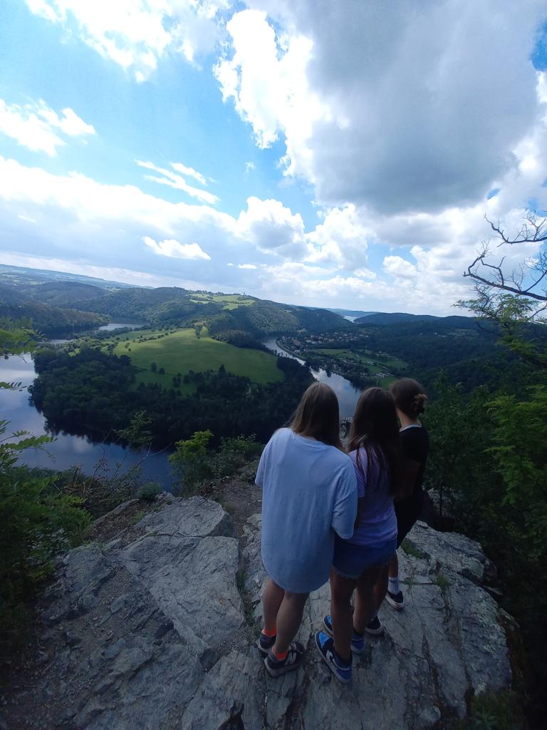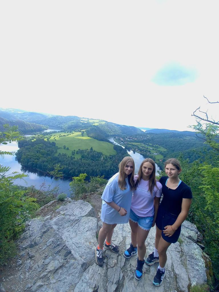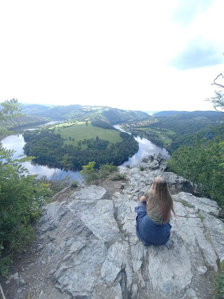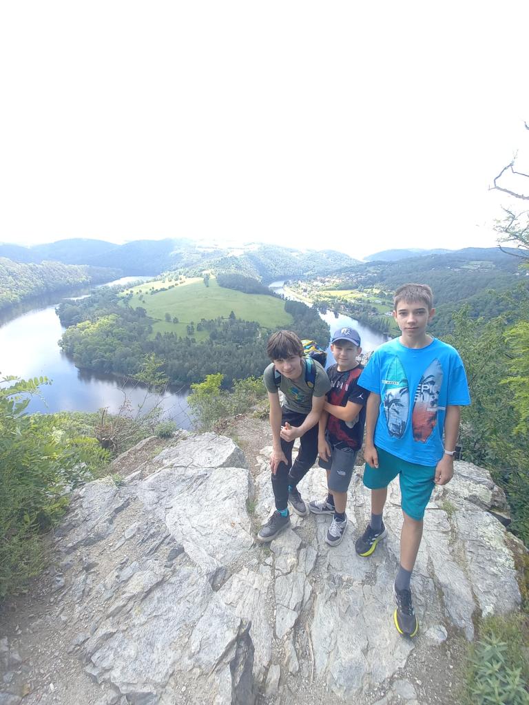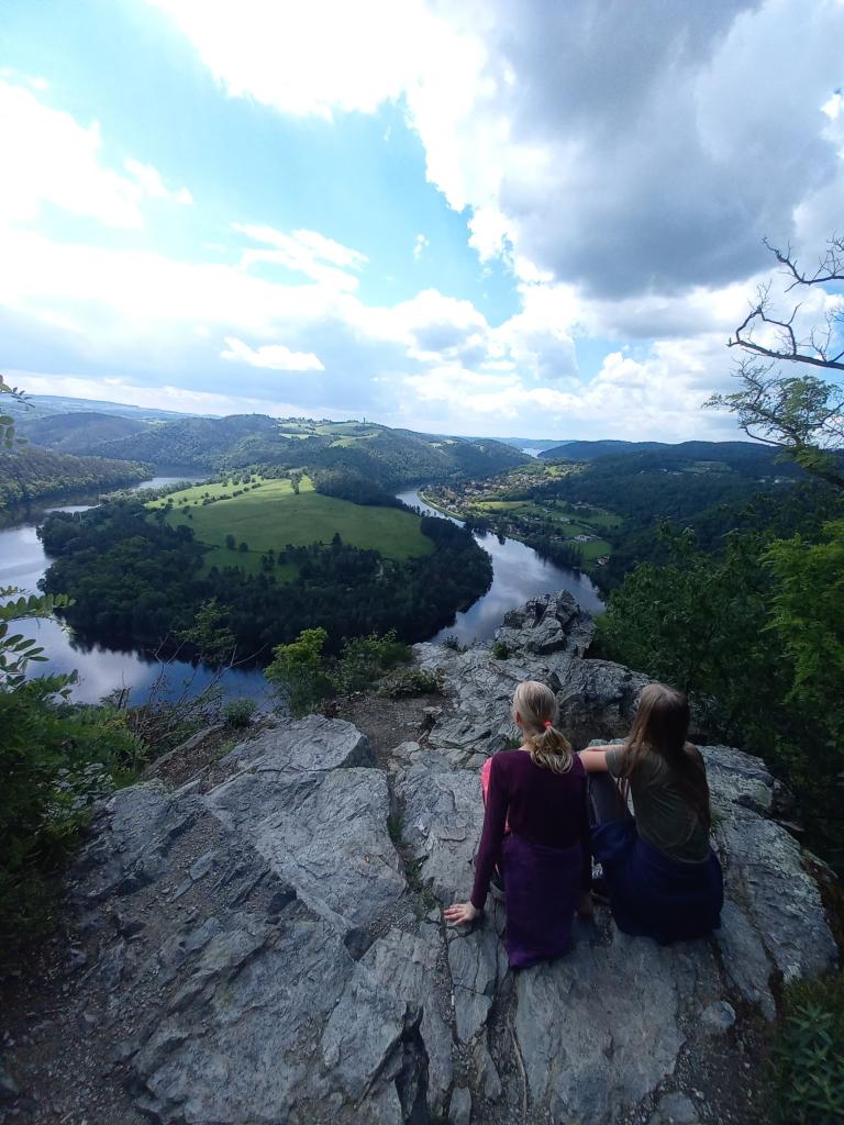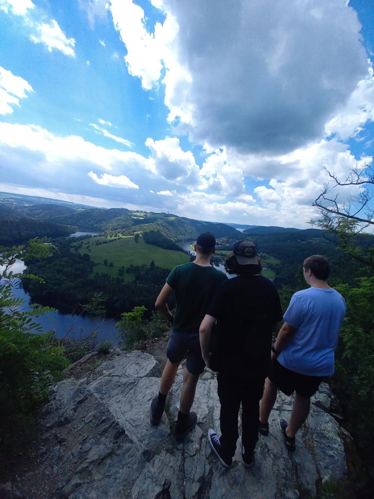 Po této náročné aktivitě jsme se před večeří vydali na procházku k vyhlídce Na Vrchovnici. Odtud se nám naskytl nádherný výhled na naše ubytování a široký meandr řeky Vltavy, což byl krásný závěr prvního dne.