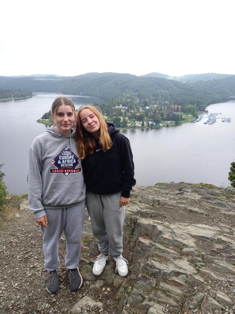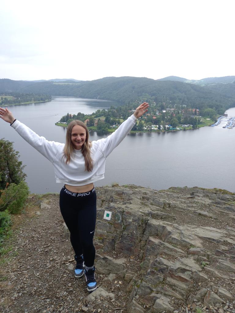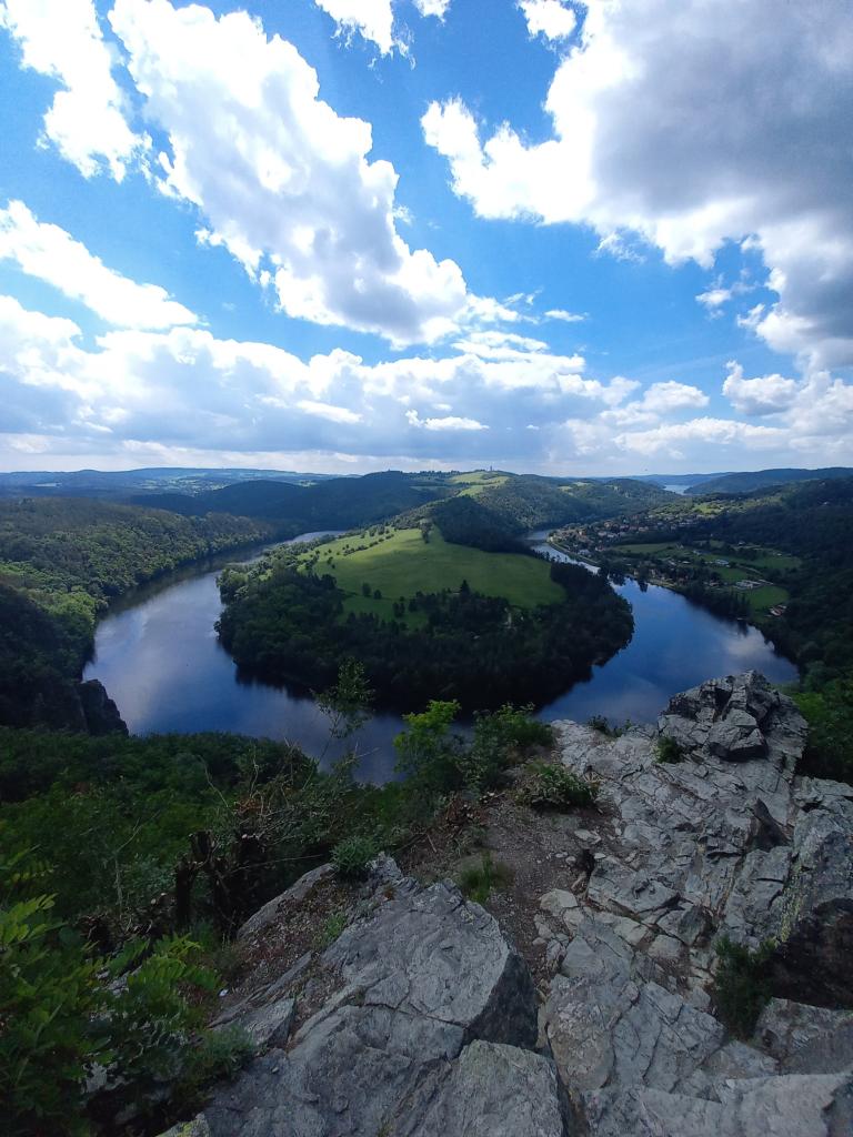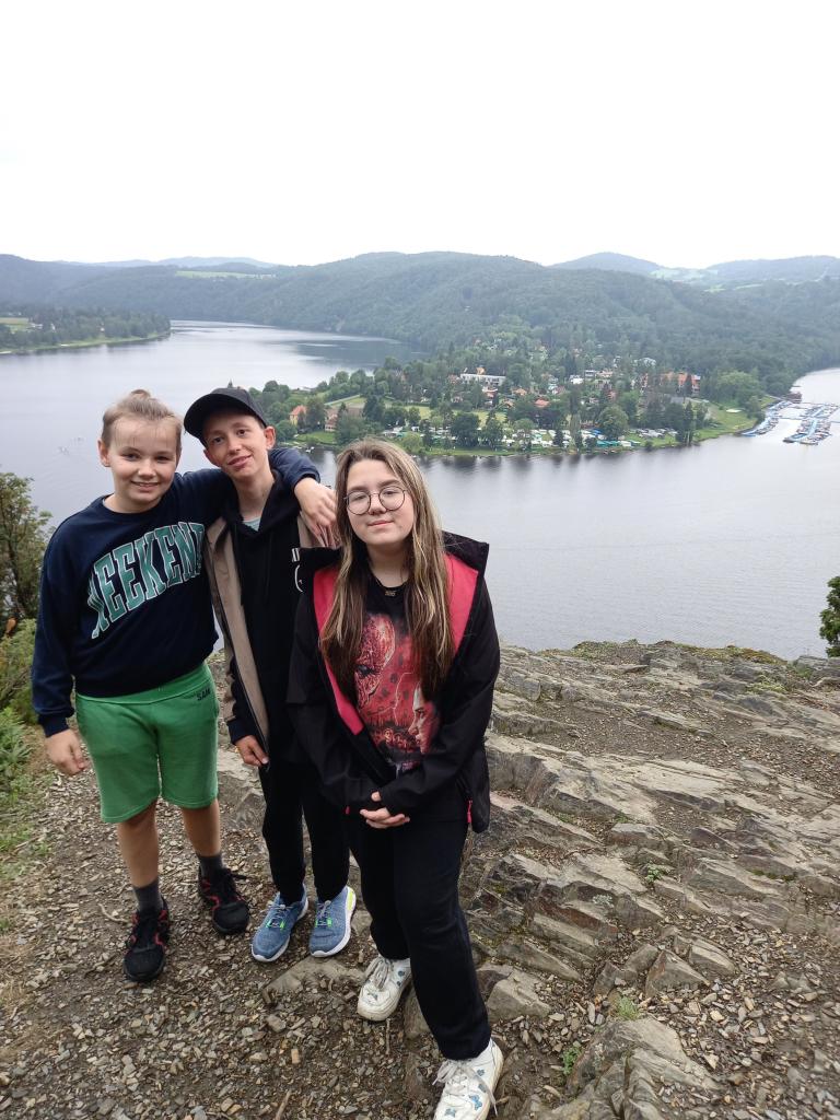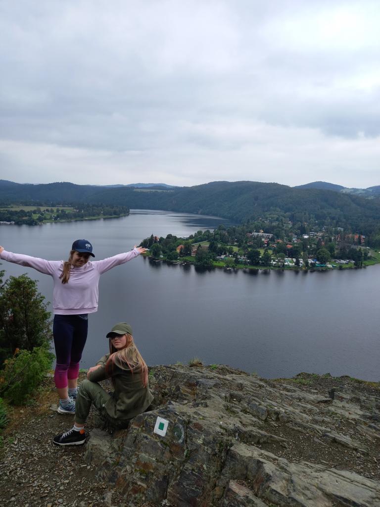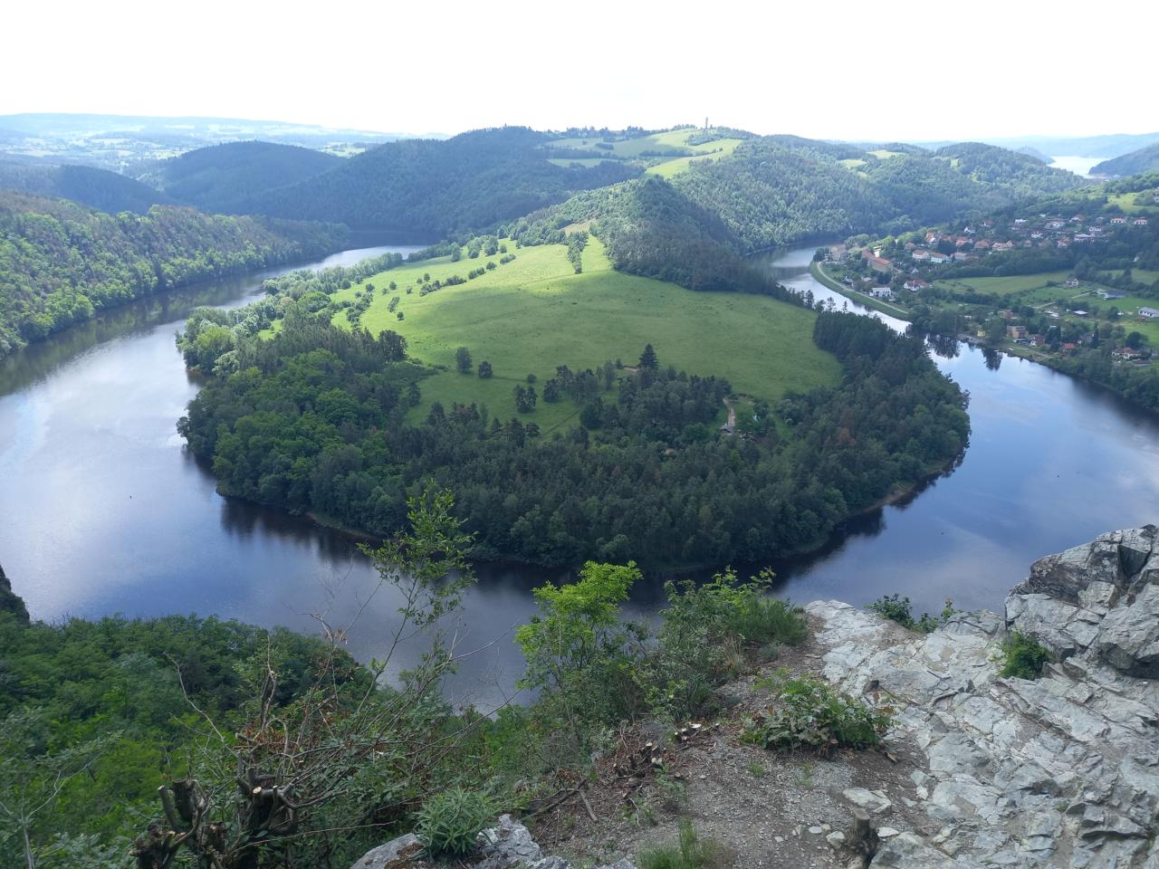 Po této náročné aktivitě jsme se před večeří vydali na procházku k vyhlídce Na Vrchovnici. Odtud se nám naskytl nádherný výhled na naše ubytování a široký meandr řeky Vltavy, což byl krásný závěr prvního dne.