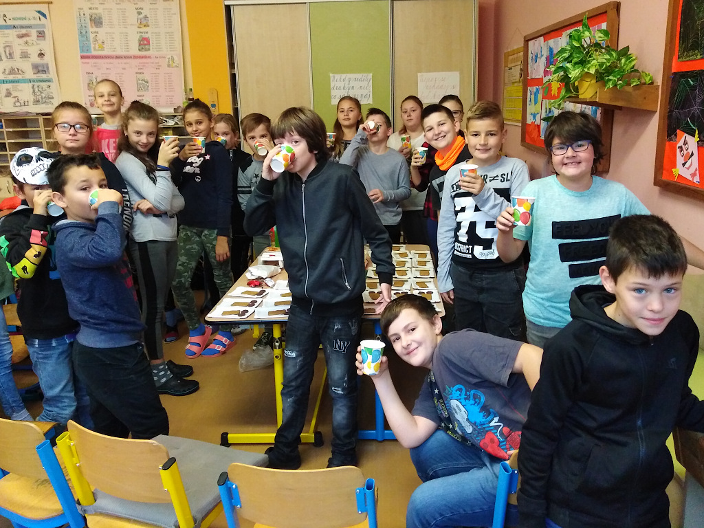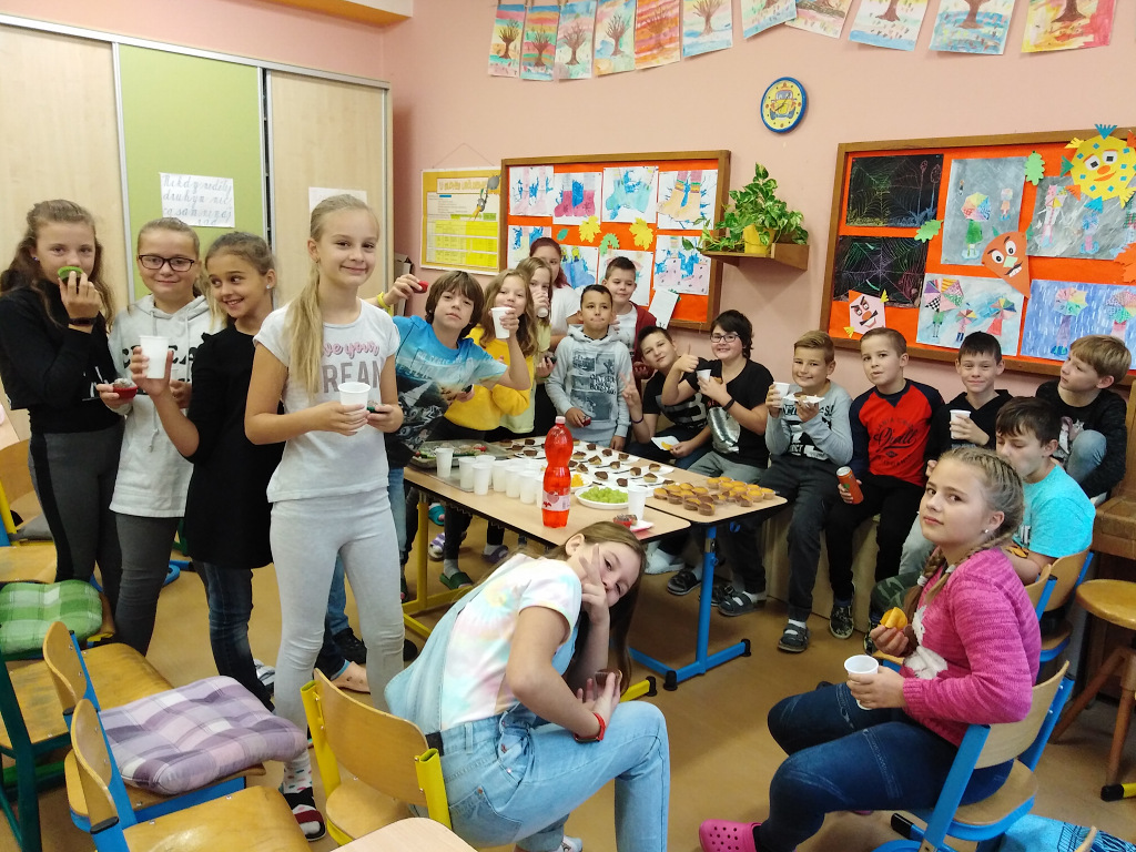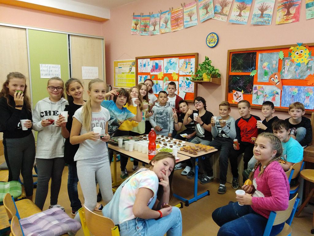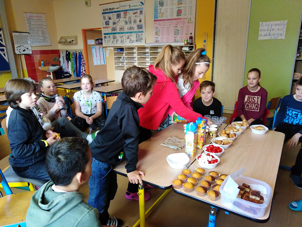 Děti z V.B se rozhodly, že si na každou třídnickou hodinu připraví občerstvení pro své spolužáky ve třídě. Každou středu přinese svačinku jiná skupina. A co jim nejvíc chutná? Na fotografiích můžete vidět, že děti už ochutnaly sladké i slané koláče, sušenky, muffiny, perníčky, croissanty a jiné dobroty. Nezapomínají ani na ovoce a zeleninu a myslí také na pitný režim.