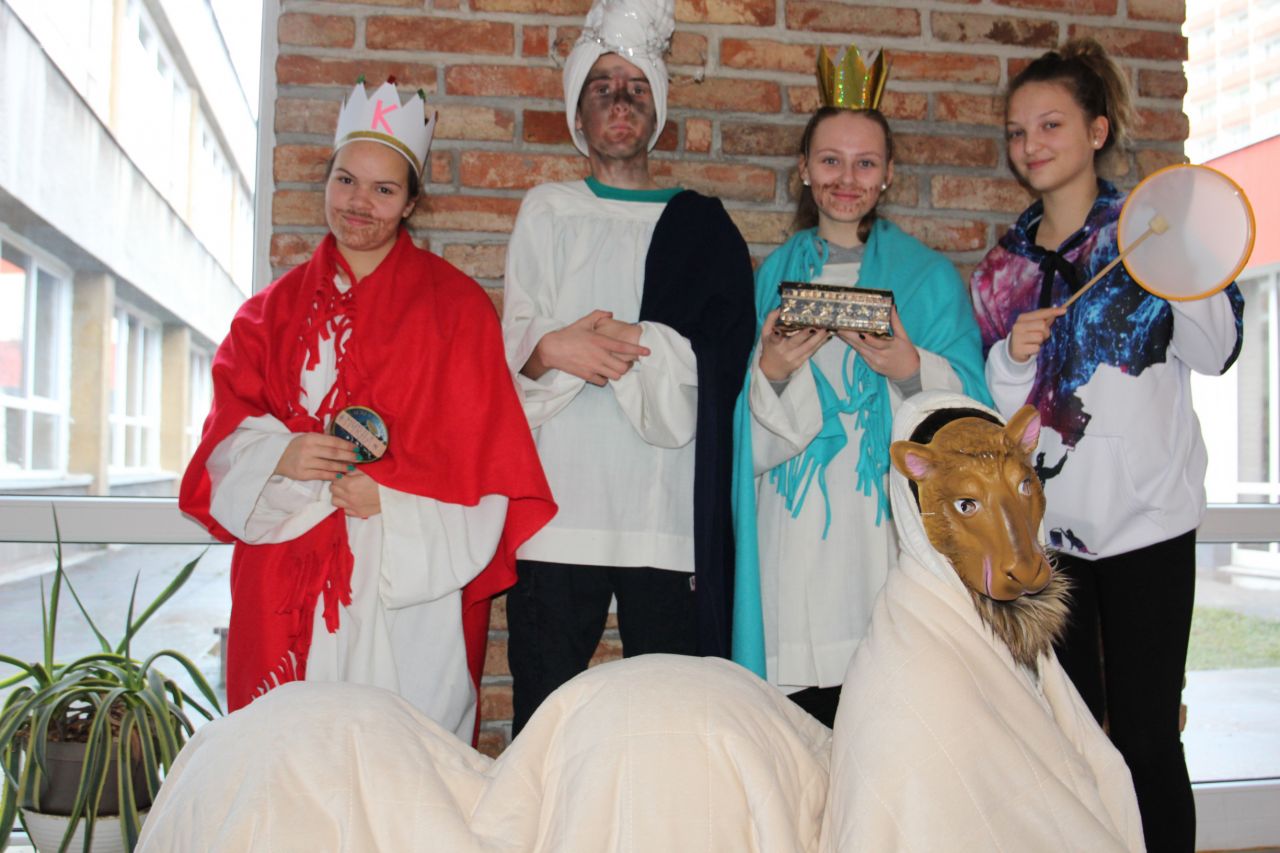Po celé škole a do všech tříd zavítali Kašpar, Melichar, Baltazar a krásný, dobře vychovaný, přátelský, smetanově bílý velbloud s černými ponožkami na kopýtkách.