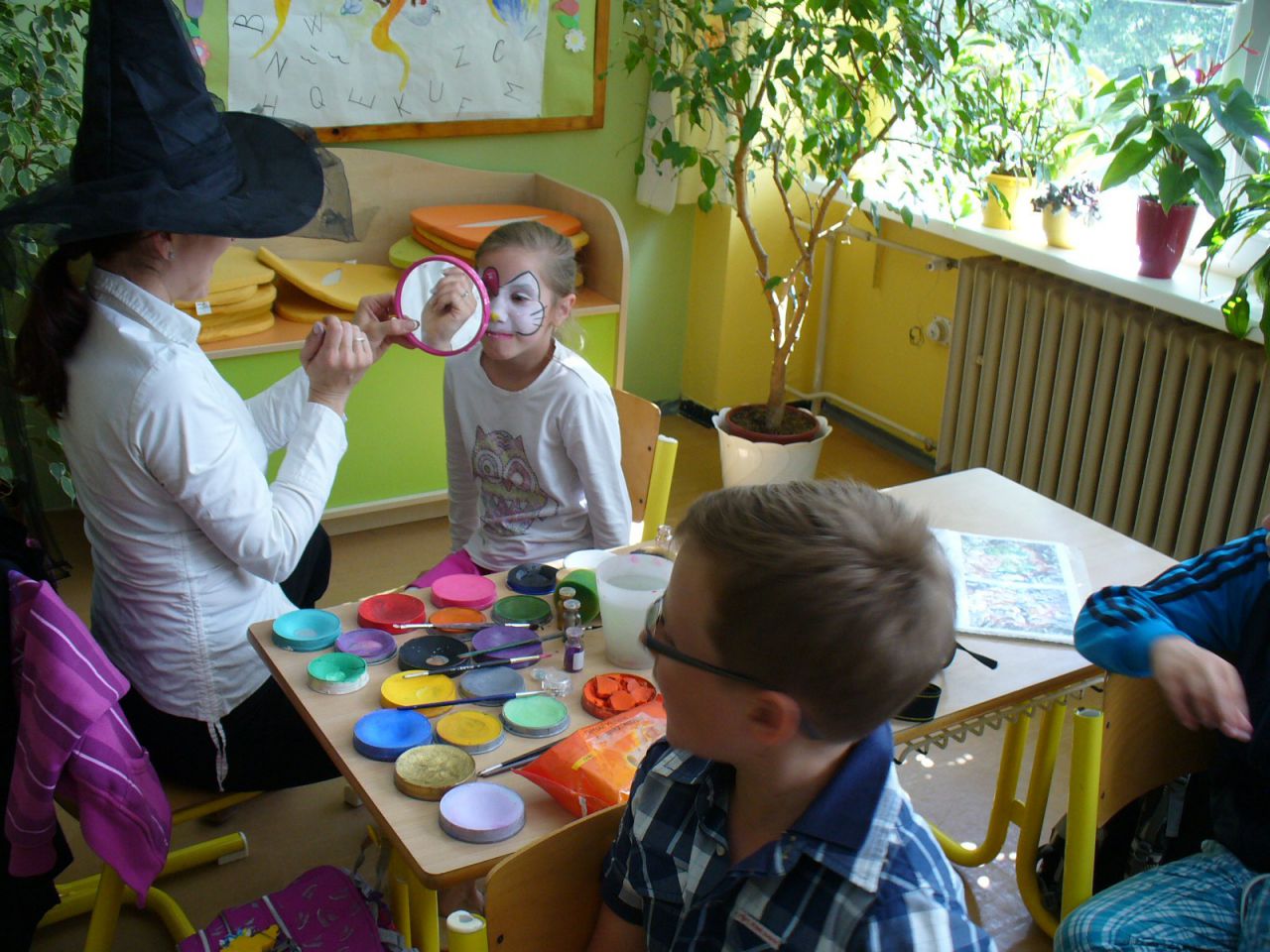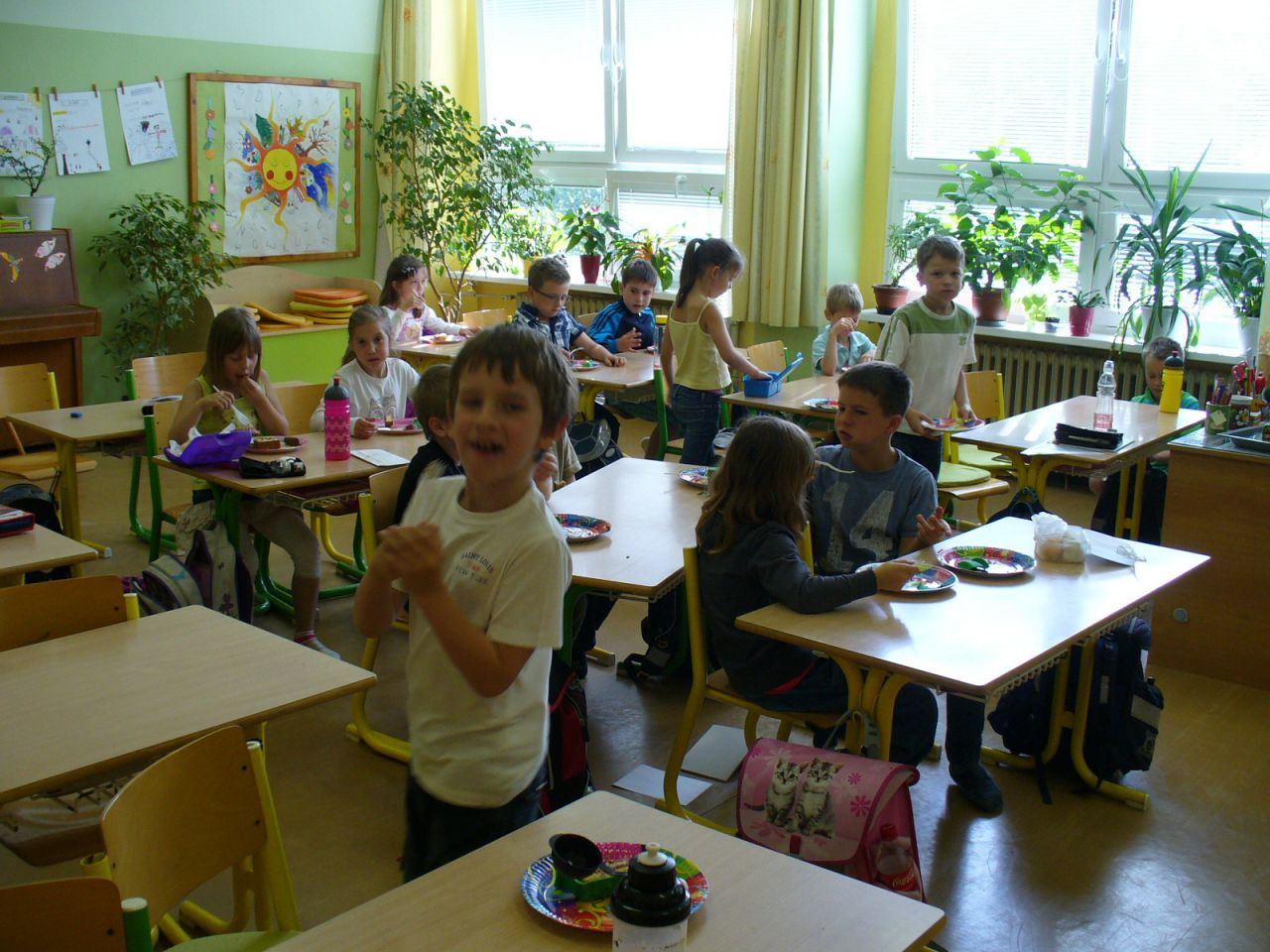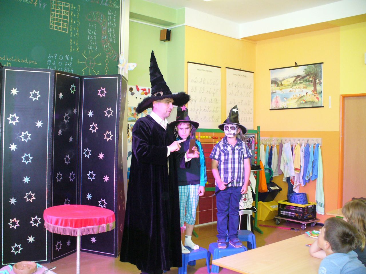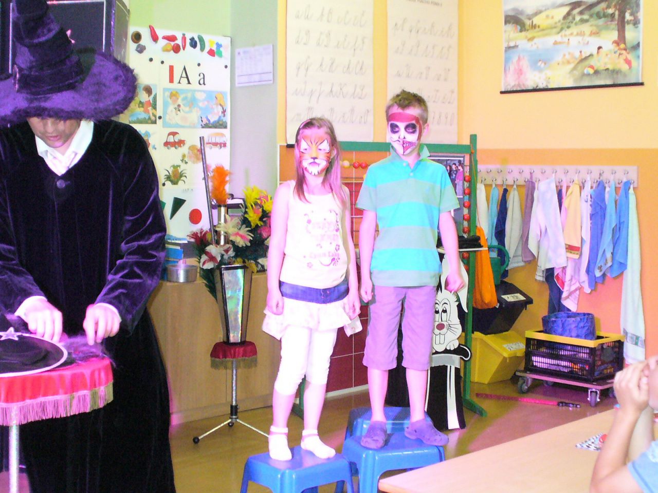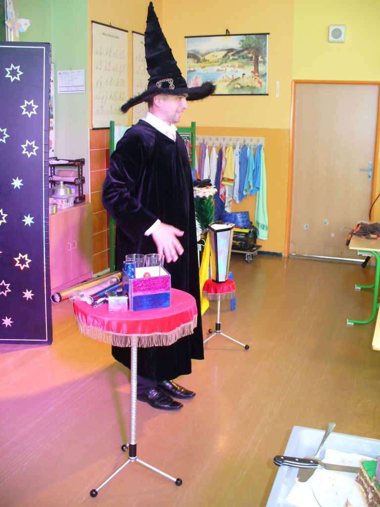 Je pátek, 14. června, 10 hodin a v 1. A začíná velká kouzelnická šou. Profesionální kouzelník pan Burda celé dvě hodiny předváděl zajímavé triky, zatímco jeho asistentka malovala dětem podle jejich výběru zajímavé tvářičky.