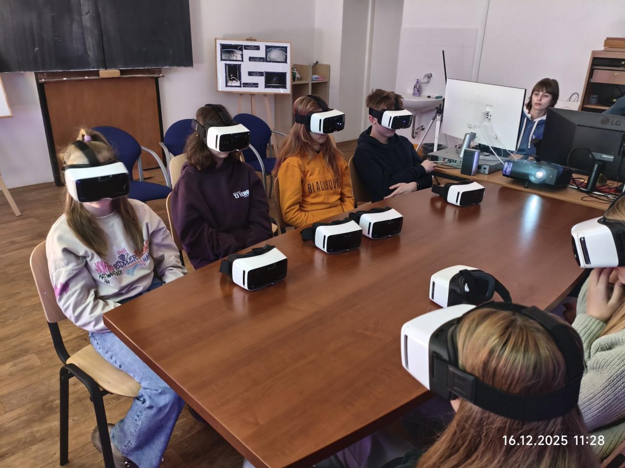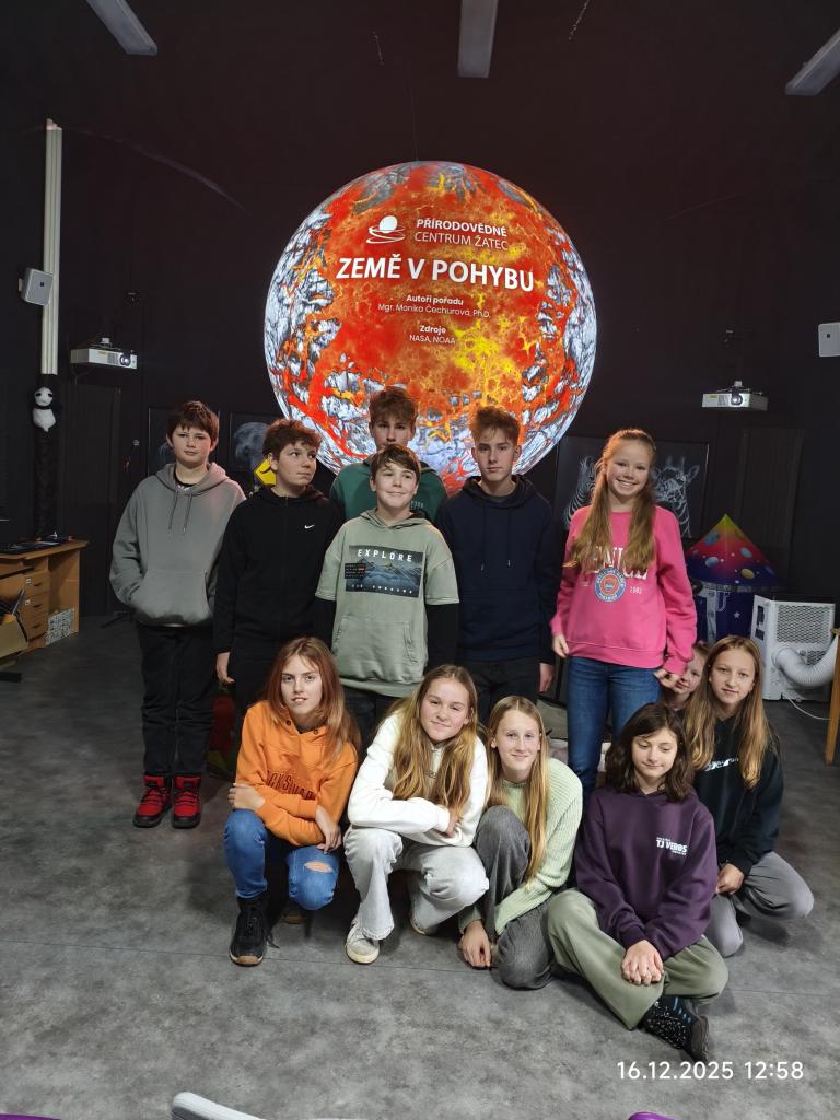 Třída 7.B měla na poslední letošní týden napilno. V úterý 16. prosince vyrazili vlakem do Žatce, kde je v Přírodovědném centru čekaly dva programy. V prvním programu se díky virtuální realitě mohli podívat od vesmírné lodi ISS a celou ji "projít" a vidět zevnitř. Ve druhém programu s názvem Věda na kouli zkoumali zeměkouli, její vrstvy, zemětřesení v reálném čase a spoustu dalších zajímavých jevů, které naše planeta nabízí.