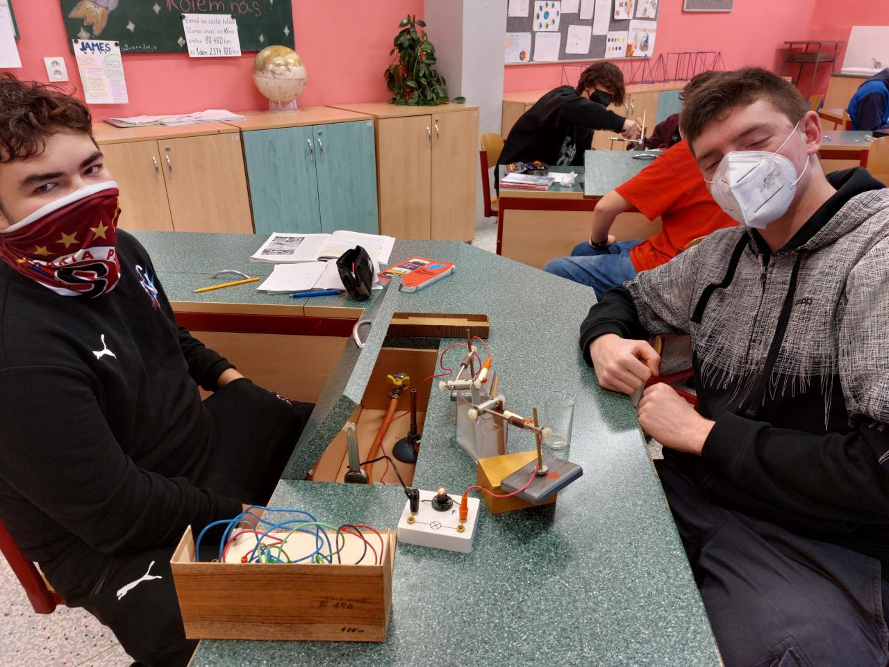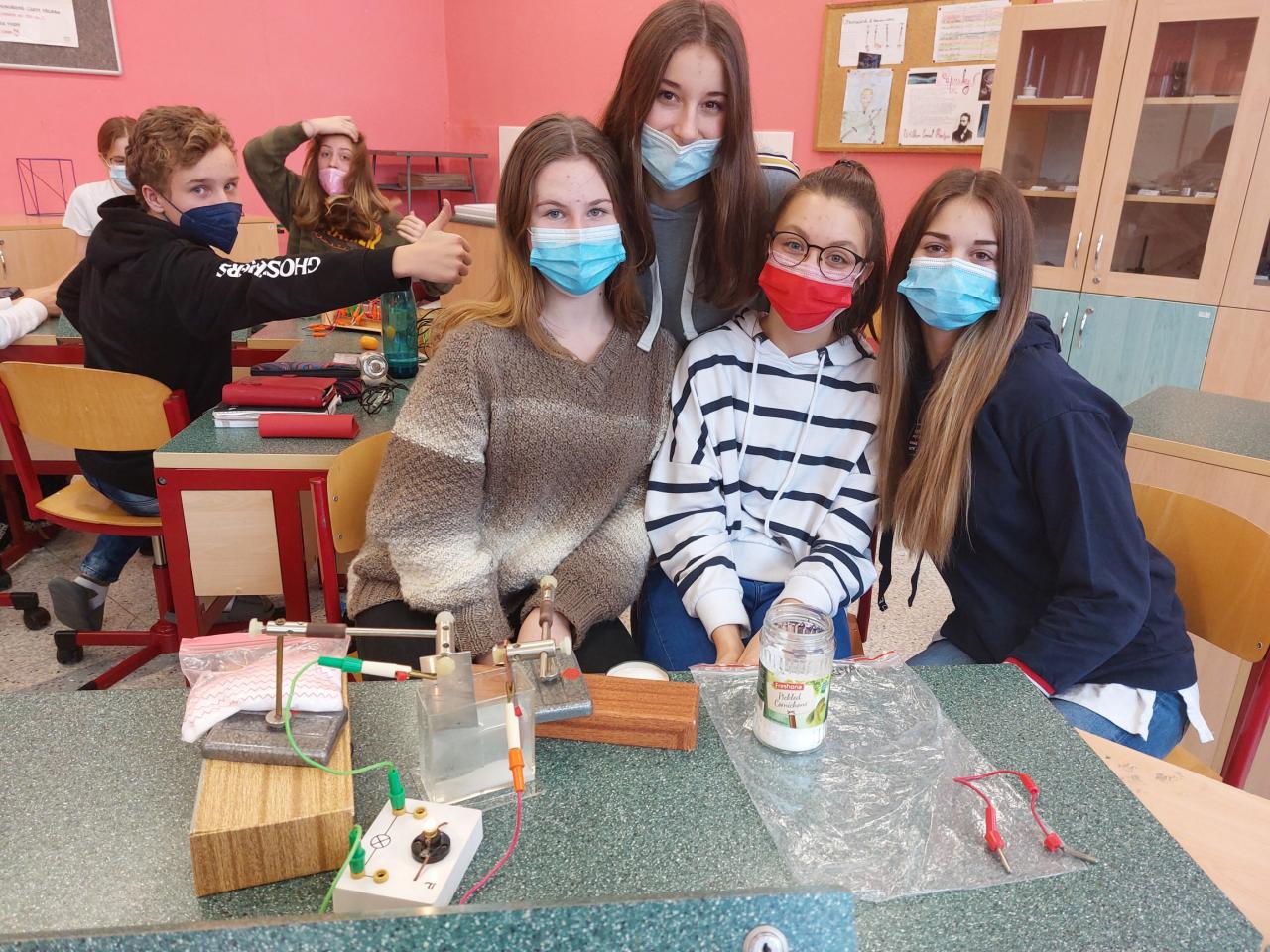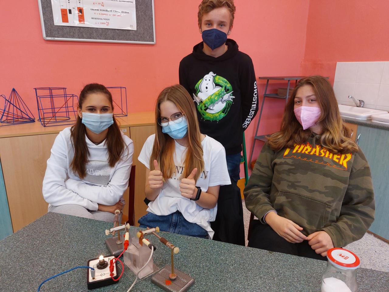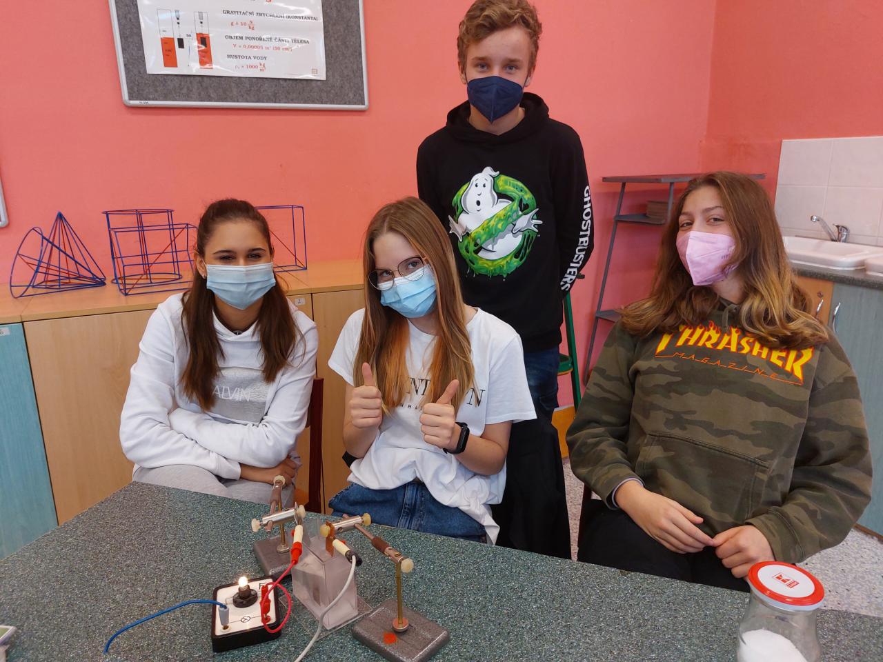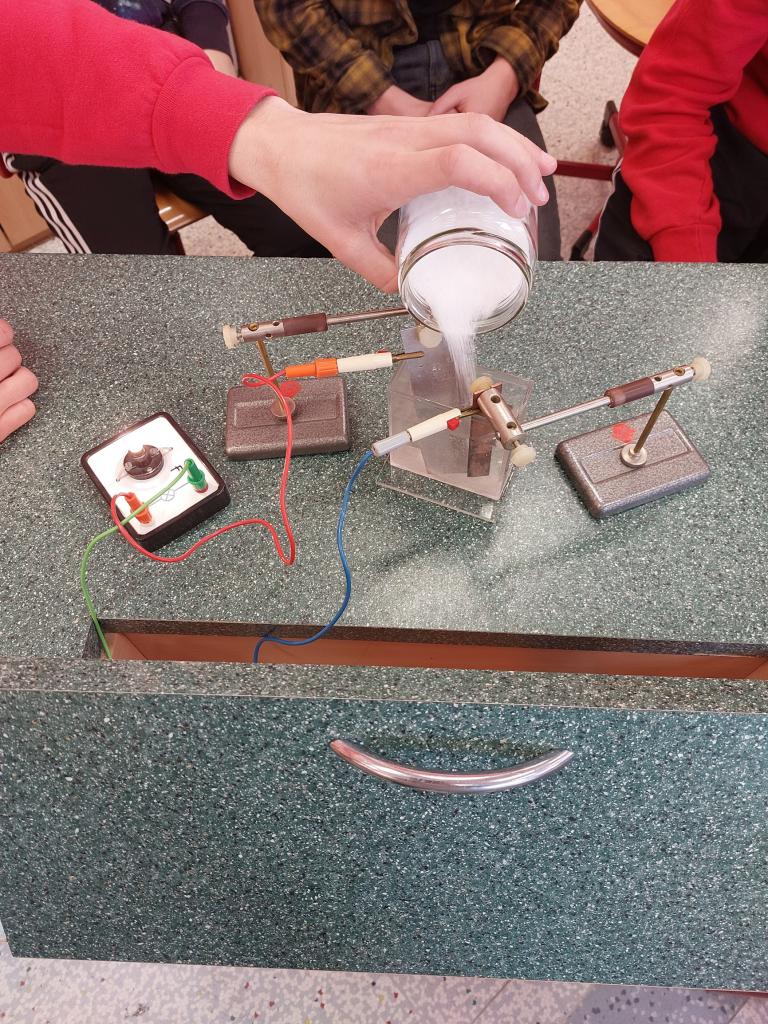 Žáci devátých ročníků zkoumali děj zvaný elektrolýza. Čím více soli do vody nasypali, tím více se jim žárovička rozsvítila. Žáci se přesvědčili, že el, proud prochází i solným roztokem.