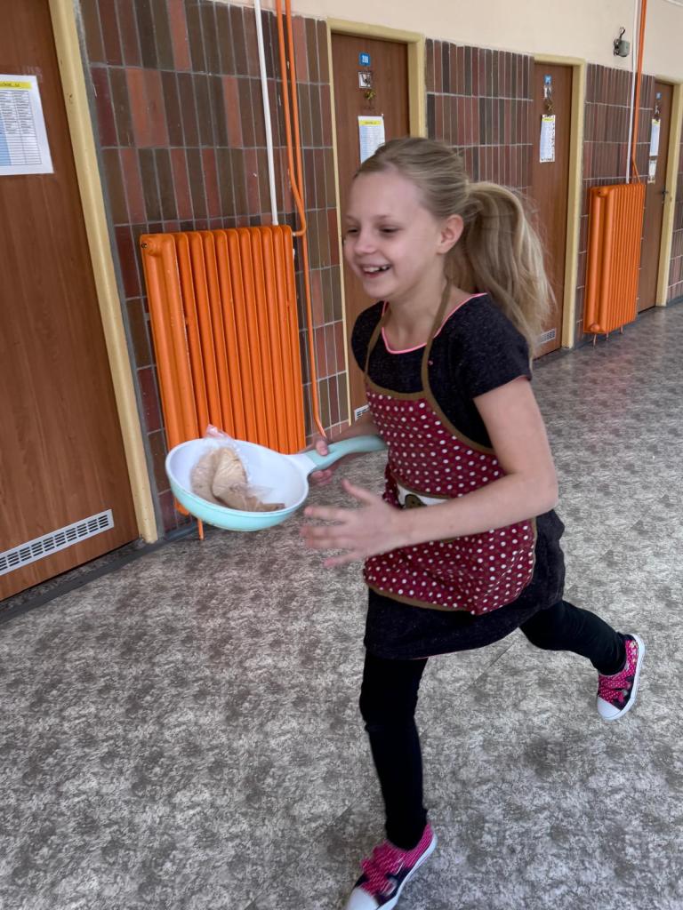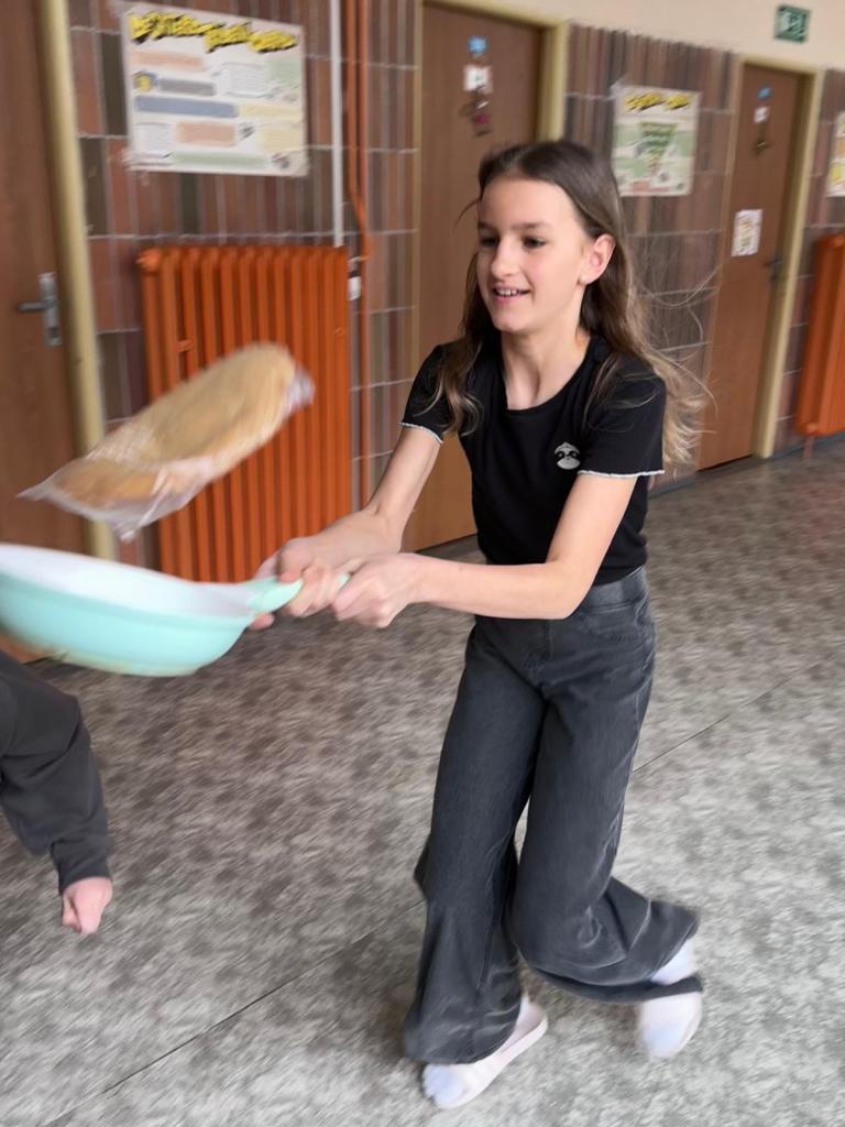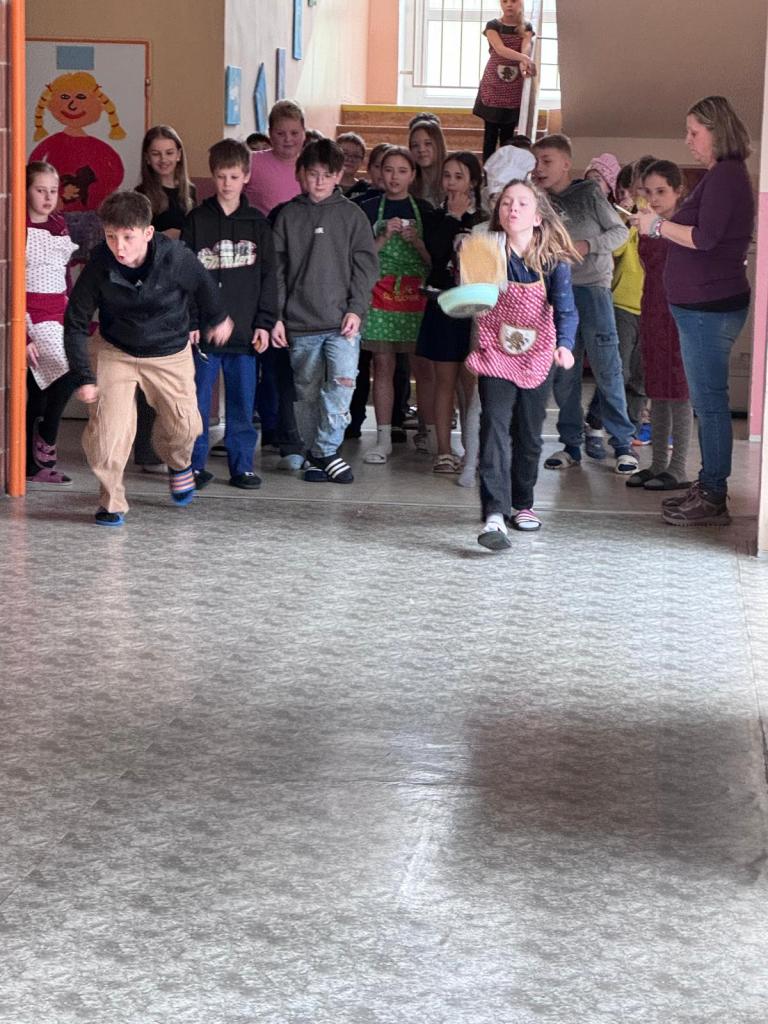 Děvčata si s nadšením vyzkoušela tradiční běh s palačinkou, zatímco chlapci předvedli svou šikovnost při aktivitě Rolling Egg, při níž museli vejce bezpečně vést po vyznačené dráze. Na závěr nechyběla sladká odměna – každý si pochutnal na vlastnoručně vyzdobené palačince. 😋