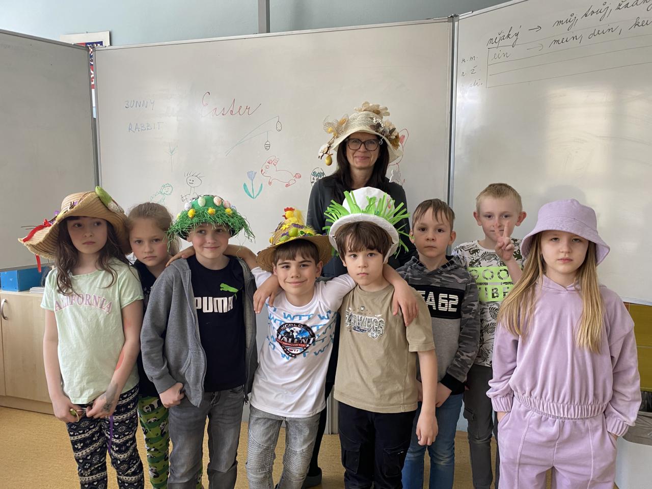 Děti si podle instrukcí a ukázky na předchozí hodině vyrobily doma velikonoční klobouky a přinesly je na hodinu angličtiny. Klobouky předvedly svým spolužákům a poté soutěžily v kutálení vajíček do dálky. Porovnali jsme velikonoční tradice v Anglii a v Čechách.
