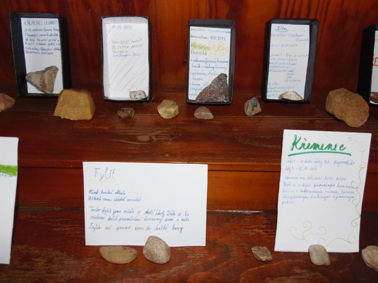 Horniny, které na výstavě uvidíte, pocházejí z širšího okolí naší školy, sami jsme je nasbírali, zmenšili do vhodné velikosti pomocí geologických kladívek, očistili a připravili k vystavení. Všechny vzorky jsme určili a popsali. Výsledek naší práce si můžete prohlédnout a zhodnotit.