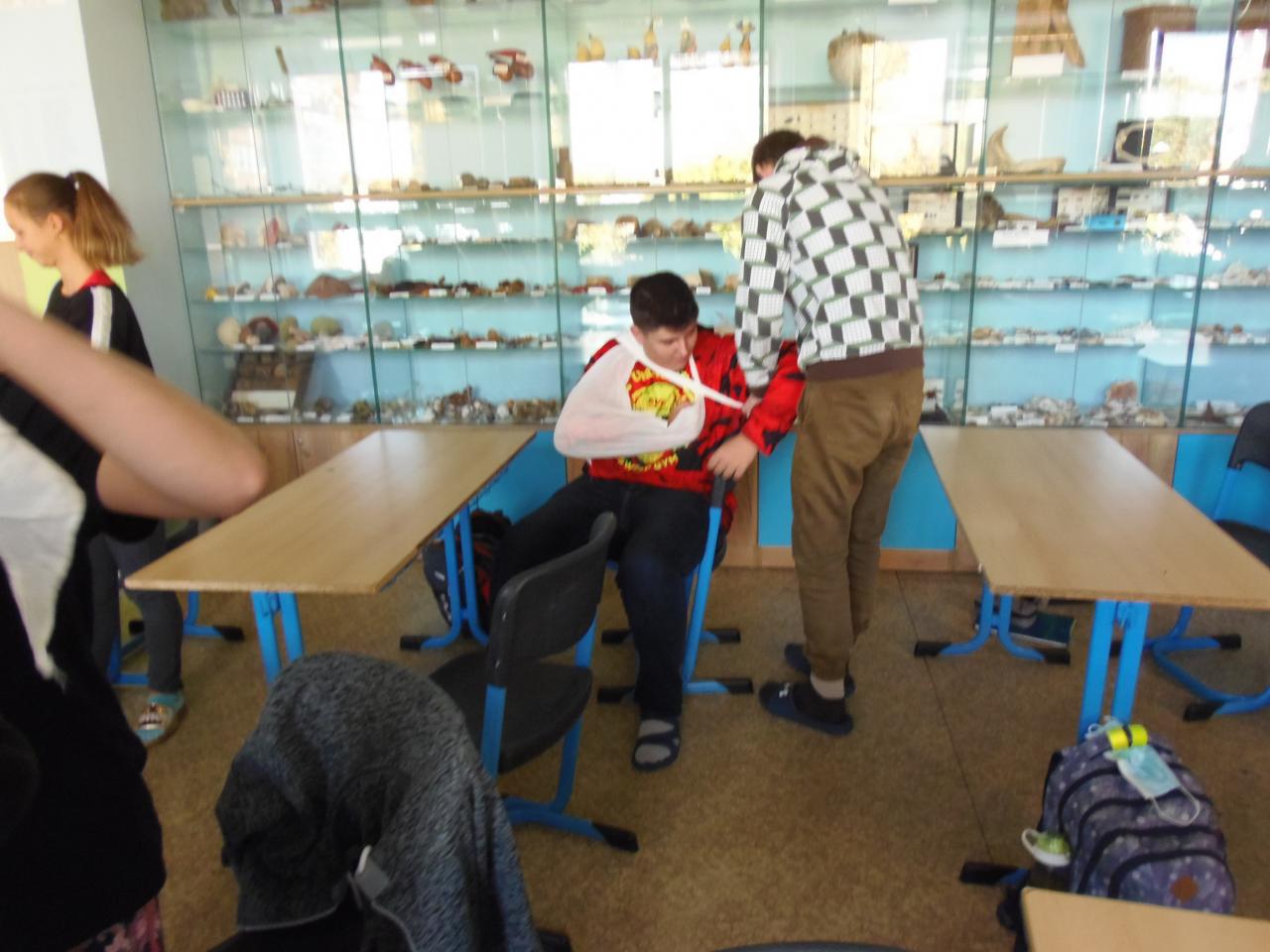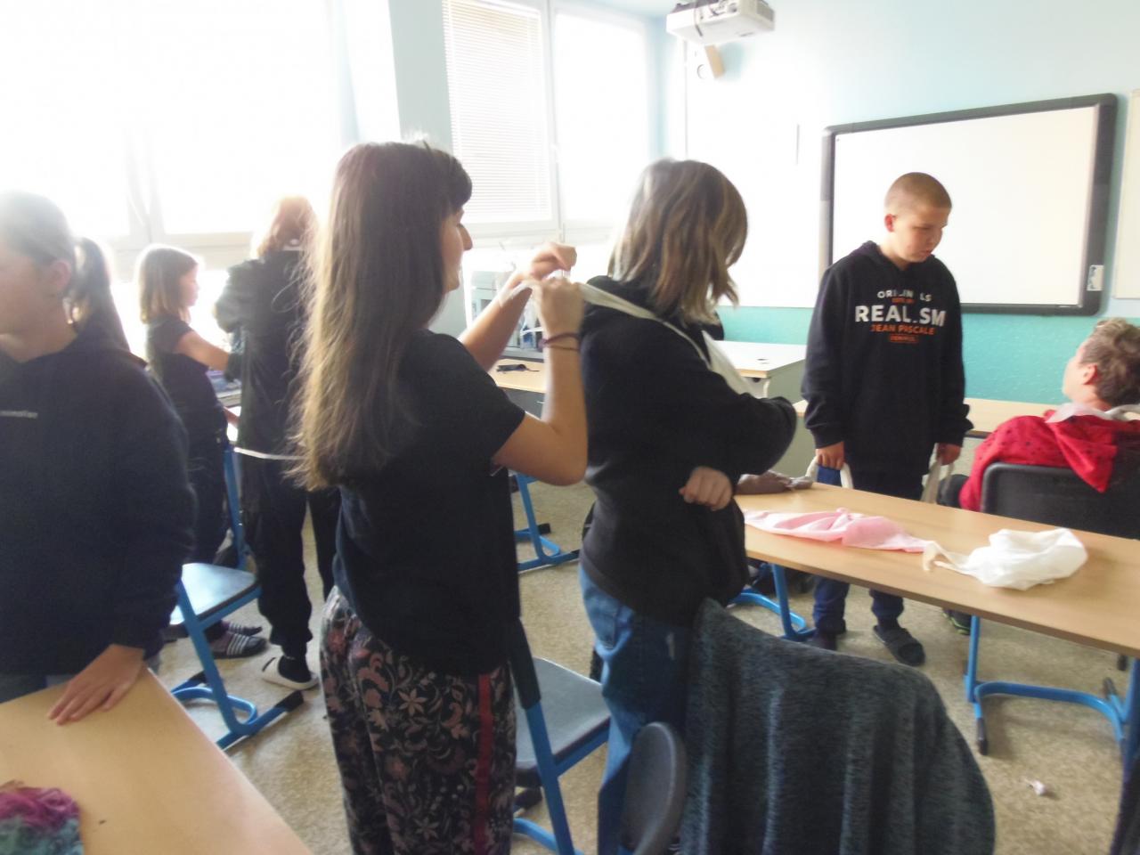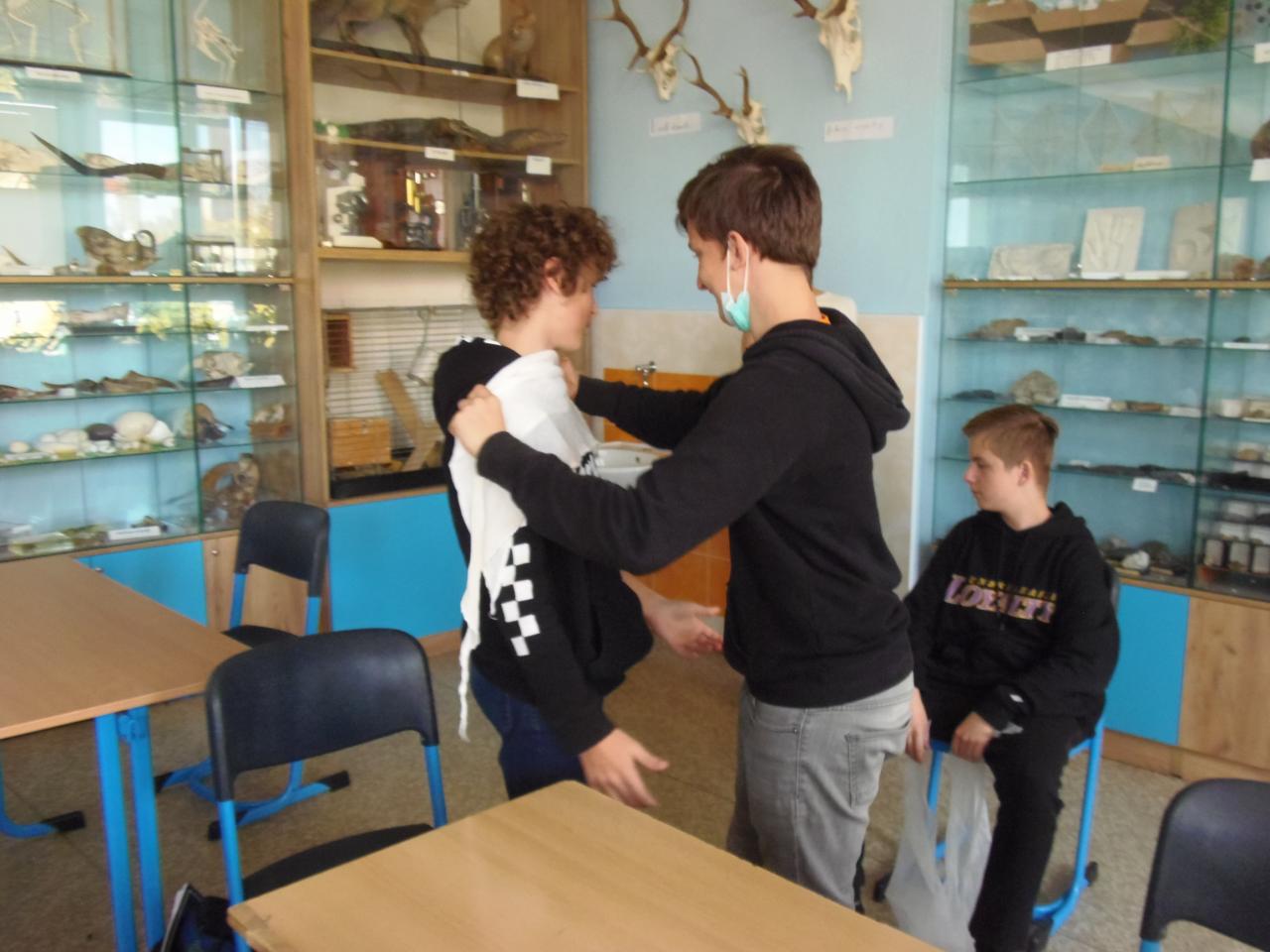 V biologii člověka v 8. ročníku se důkladně věnujeme první pomoci. Jednoduchým začátkem, který by měl zvládnout každý, jsou právě šátkové obvazy, ošetření nejrůznějších zranění bez obvazového materiálu, jen za pomoci šátků.