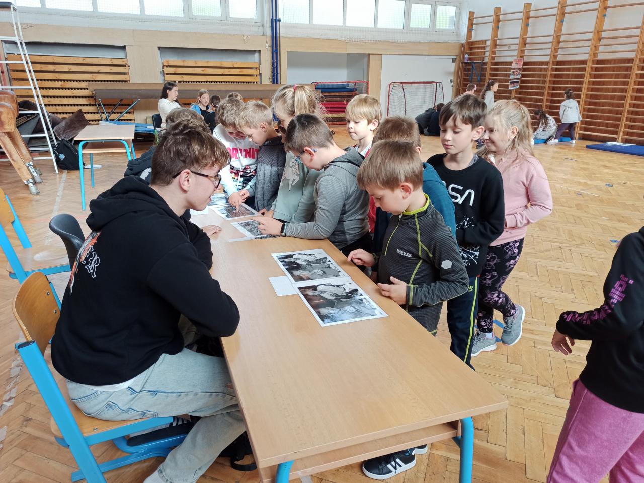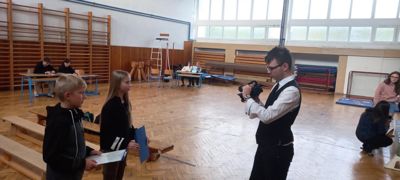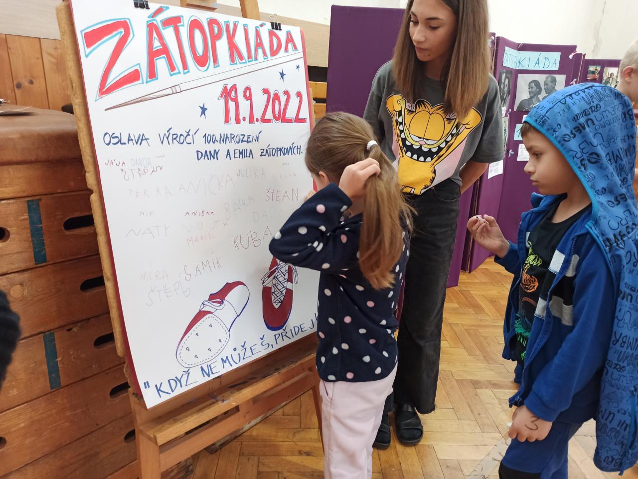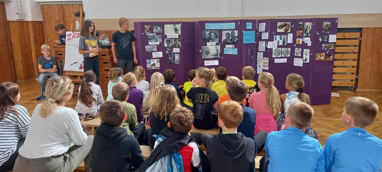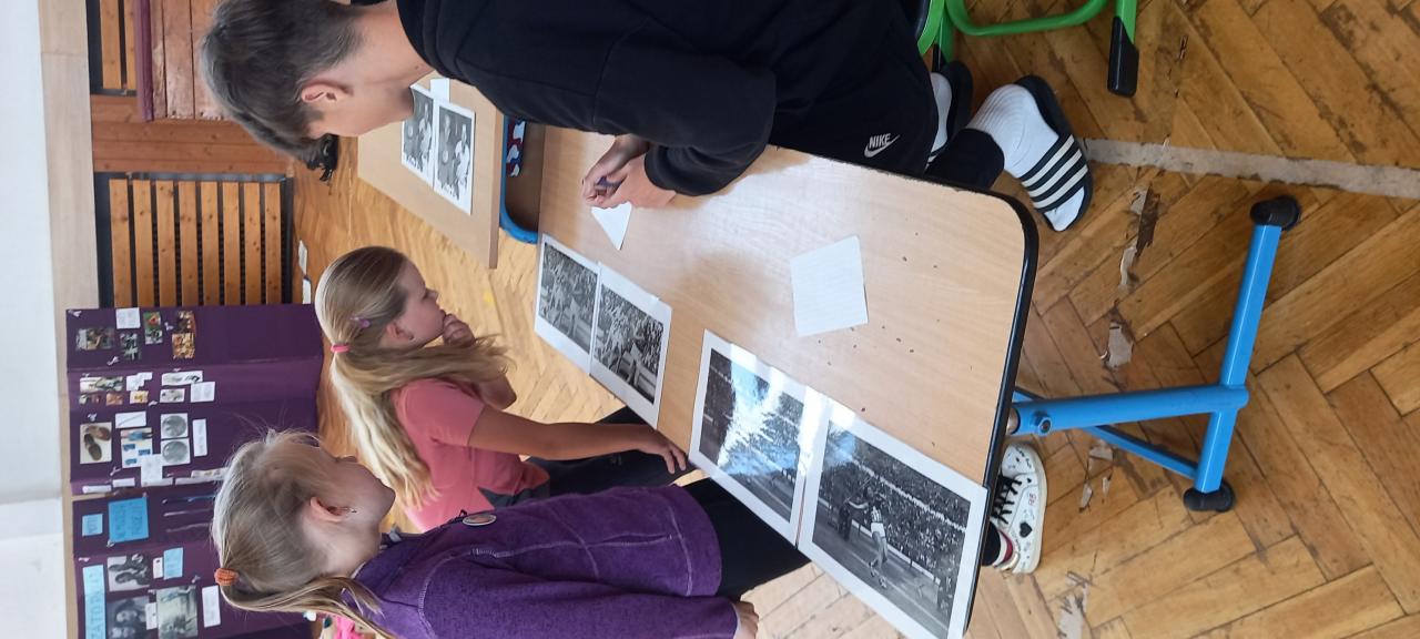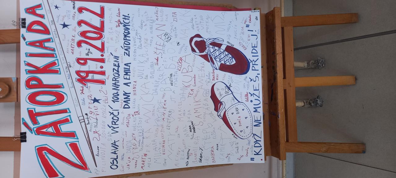 Sport jsme okořenili ještě ochutnávkou informací ze života manželů Zátopkových a hrami, které jsme si pro děti připravili v improvizovaném muzeu. To jsme zřídili i za přispění materiálu z Lašského muzea v Kopřivnici, kde je aktuálně věnovaná celá expozice kopřivnickému rodáku Emilovi a jeho ženě Daně. Našimi průvodci Zátopkiádou byli moderátoři ze 6.A, muzejní průvodci ze 7.A a řada rozhodčích z 8.C a 9.B.