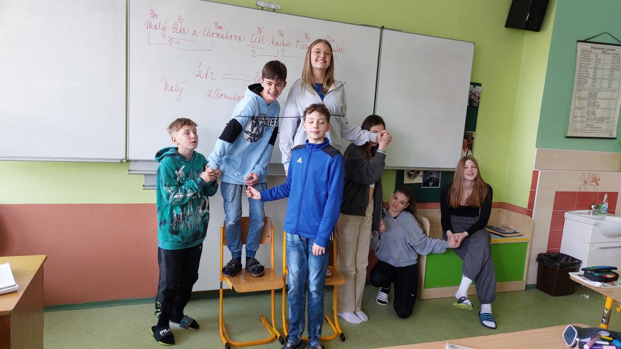 Proč jsou Jery s Terkou svázáni a stojí při hodině mluvnice na židli? Odlišili jsme je jako "šéfy" větných členů, tedy zakladní skladební dvojici. Aby těmto dvěma nebylo smutno, volají k sobě ostatní rozvíjející větné členy. A proč se Kuba s Markem drží svého podmětu - Jeryho? Protože každý správný přívlastek závisí na podstatném jméně. Aneb jak funguje valence větných členů v praxi.