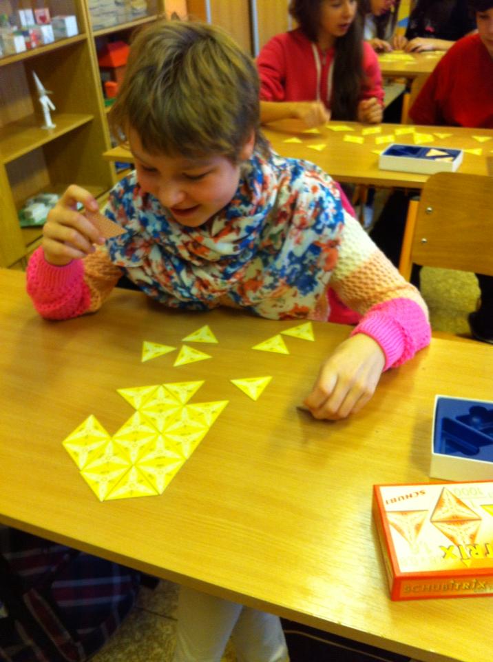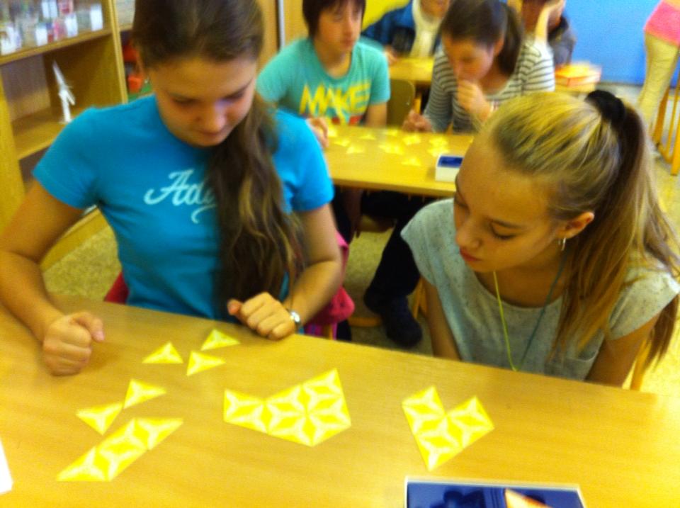 Žáci sedmých ročníků zažili hodinu matematiky, ve které zopakovali znalosti o zlomcích a zároveň si u toho zaběhali :). Dvě skupiny soutěžili ve hře - štafetový běh, ve kterém bylo hlavním úkolem najít mezi spoustou kartiček se zlomky takové, které nebyly v základním tvaru. V příštím kole hráli žáci štafetové pexeso, kdy hledali dvojice nepravých zlomků a zlomků smíšených. Zbylé skupiny skládali ornamenty ve hře schubitrix, ve které hledali dvojice zlomků a odpovídajících desetinných čísel.